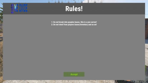 { "Text": [ "1: Do not break into peoples bases, this is a pve server!", "2: Do not steel from players bases/inventory and so on!" ], "UI": { "MainPanel": { "BackgroundColor": "0.5 0.5 0.5 1", "Size": { "AnchorMin": "0 0", "AnchorMax": "1 1", "OffsetMin": "25 25", "OffsetMax": "-25 -25" } }, "Header": { "Text": "Rules!", "FontSize": 60, "FontColor": "1 1 1 1", "BackgroundColor": "0.33 0.33 0.33 1", "Size": { "AnchorMin": "0 1", "AnchorMax": "1 1", "OffsetMin": "0 -100", "OffsetMax": "0 0" }, "Image": { "Shown": true, "ImageURL": "https://weoxide.net/uploads/monthly_2022_02/713574979_WEOXIDE_basic-file-1022200x106.png.160179787166532ce1a2b0924939fb25.png", "Size": { "AnchorMin": "0 0.5", "AnchorMax": "0 0.5", "OffsetMin": "69 -40", "OffsetMax": "211 40" } } }, "Rules": { "FontSize": 18, "FontColor": "1 1 1 1", "Size": { "AnchorMin": "0 0", "AnchorMax": "1 1", "OffsetMin": "35 70", "OffsetMax": "-35 -135" } }, "AcceptButton": { "Text": "Accept", "TextColor": "0.511 0.837 0.021 1", "TextSize": 22, "BackgroundColor": "0.3921569 0.4705882 0.2745098 1", "Size": { "AnchorMin": "0.5 0", "AnchorMax": "0.5 0", "OffsetMin": "-90 30", "OffsetMax": "90 70" } } } }