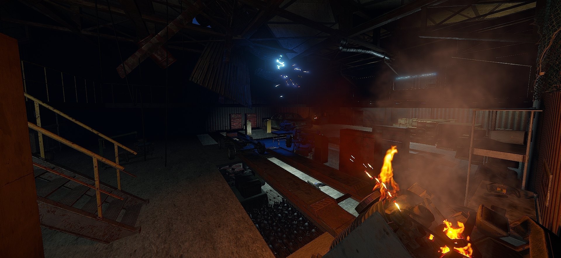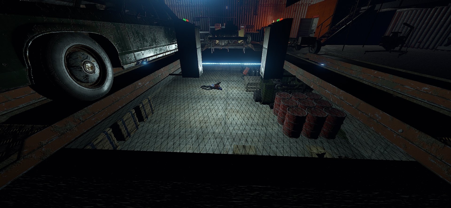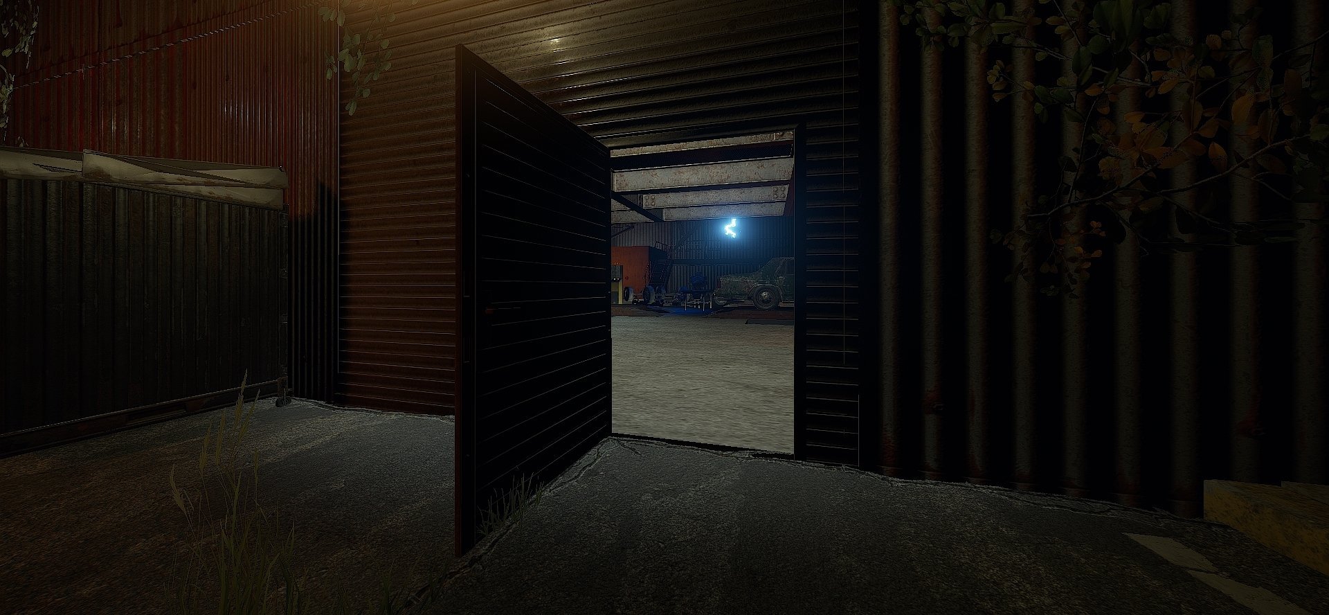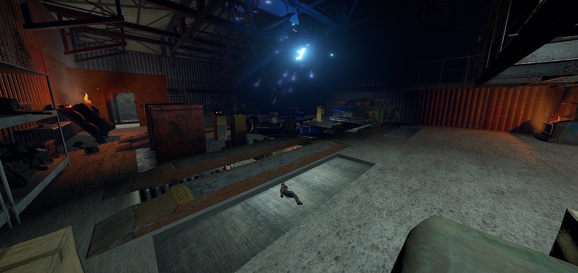 A custom garage-junkyard combined with a green and red key-card puzzle.