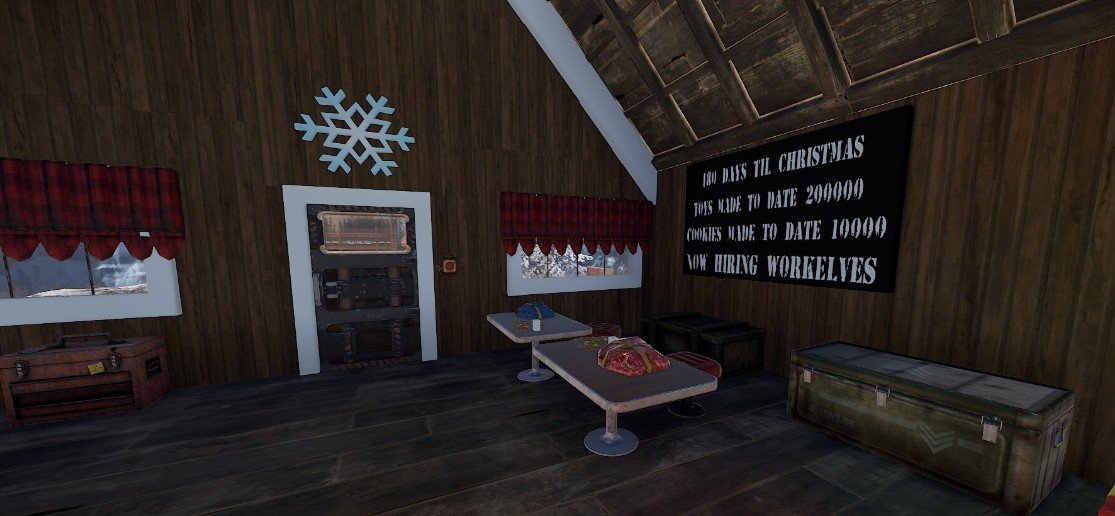 Santas workshop comes with a custom Snowman Recycler. You enter the workshop with a red door. NPC's inside. Lots of loot in and around the property. Entity count 712.