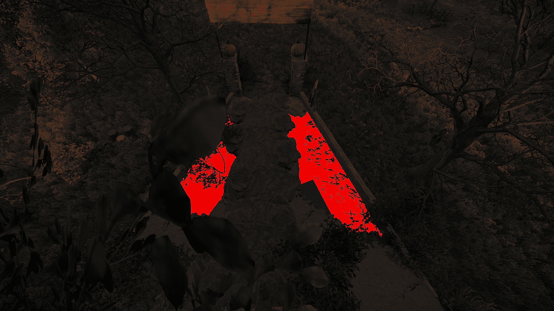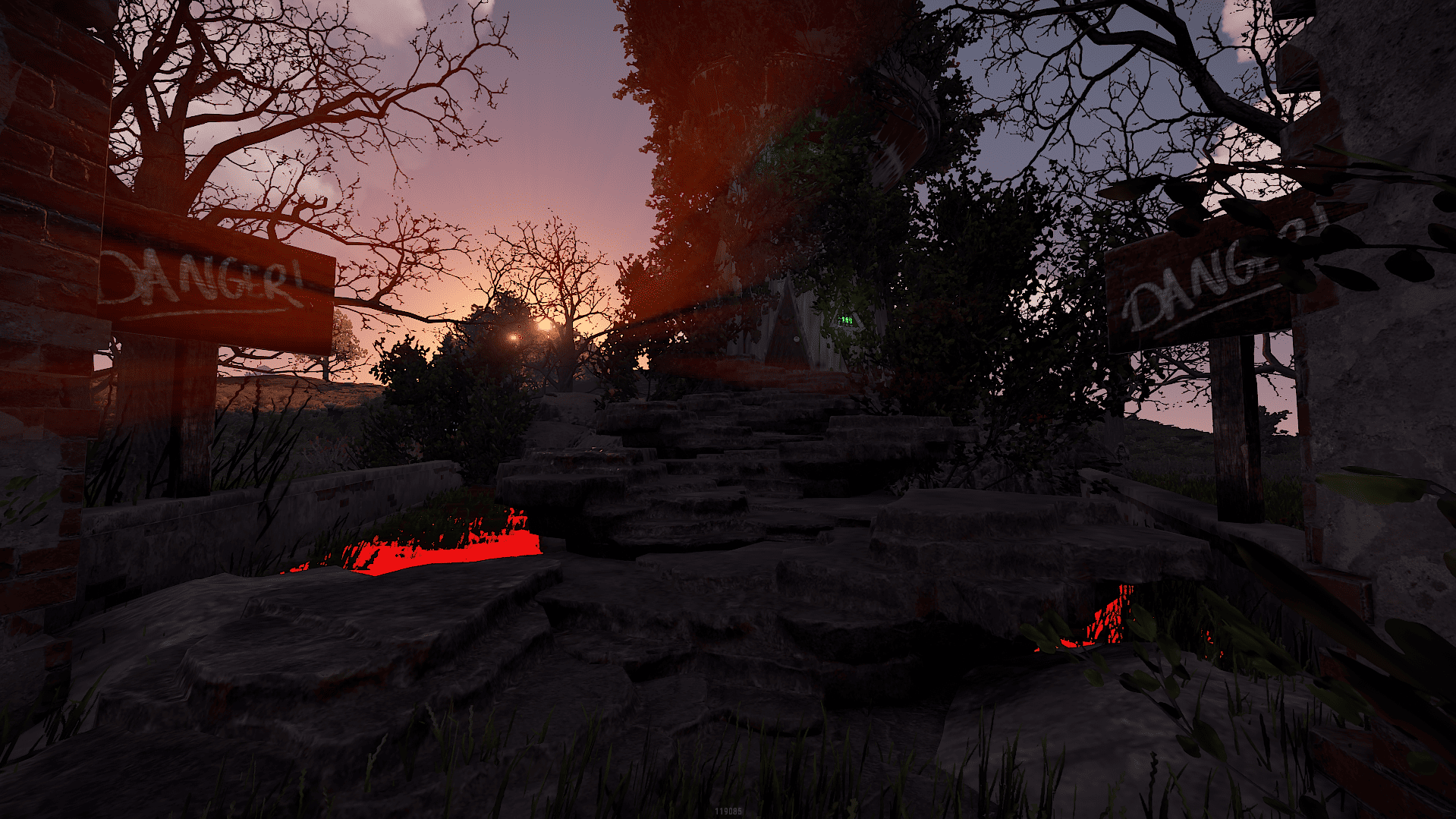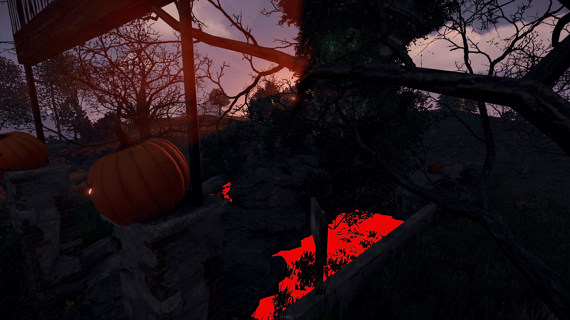 Various loot and NPC's. Bloody red water runs around the prefab. Collider placed inside to cause damage to the player if they disobey the danger signs and go for  a swim. Pumpkins with glowing eyes greet you at the gates. Eerily green glowing lights come from the window and the top floor. We just Dr. Finkelstein  is up to some kind of new experiment while Sally tends to her garden of deadly nightshade on the side with her bench.