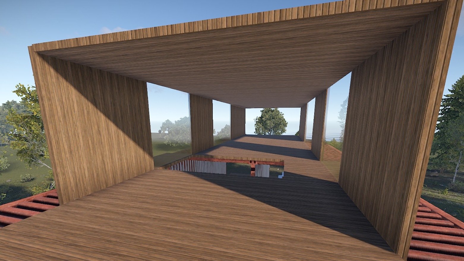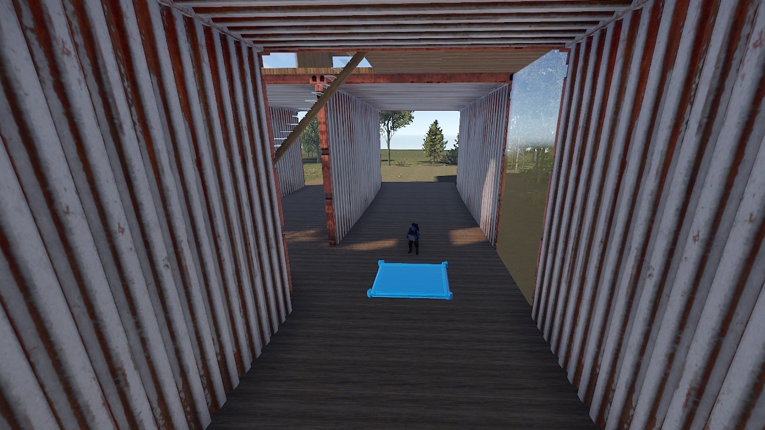 This base consists of two oversized shipping containers and a wooden house part connected with a long glass staircase.