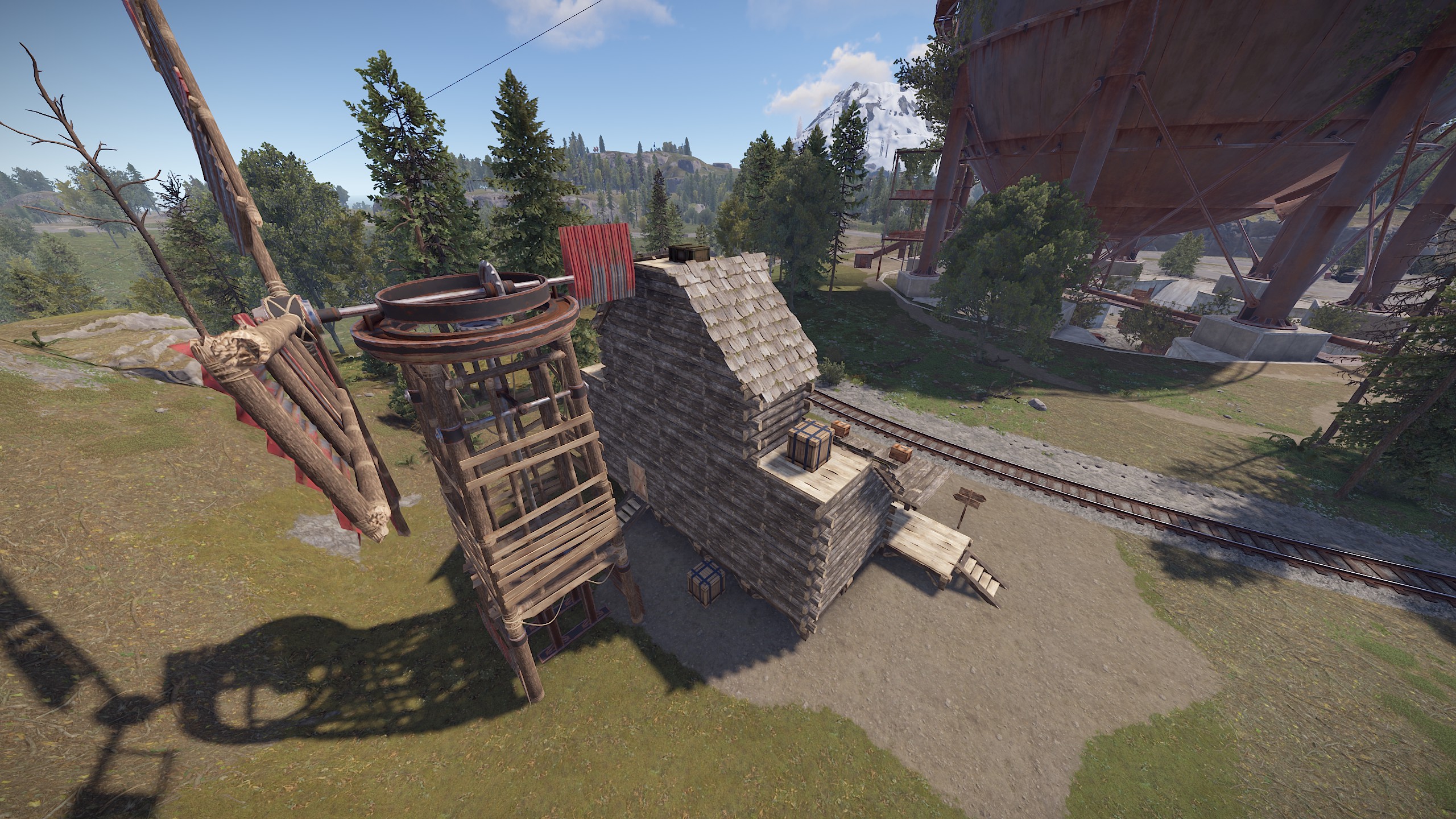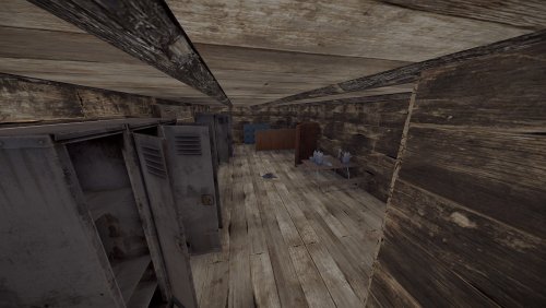 Featuring a green & blue keycard puzzle with parkour elements to get the loot! A recycler and level 2 workbench are on the middle floor and are accessible from the roof if you can jump in through the window. Locked doors will prevent you from going up or down so you will need to go through the main floor and solve the puzzle to get loot on the upper floor behind the blue carded door.