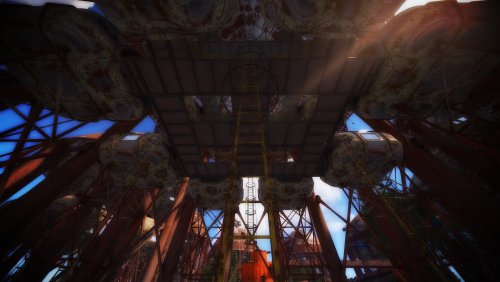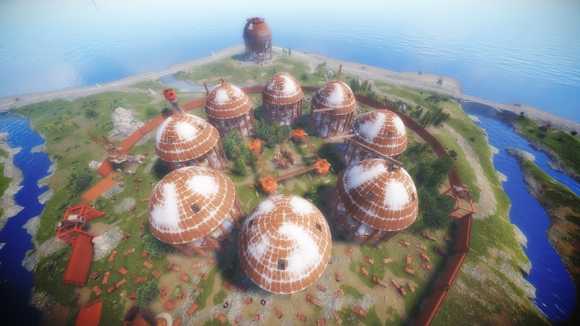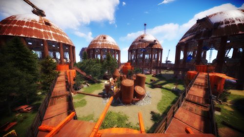Surrounded by a large wall which offers a defense for your team. The community offers a decorative space for your Rust server, junkyard style.