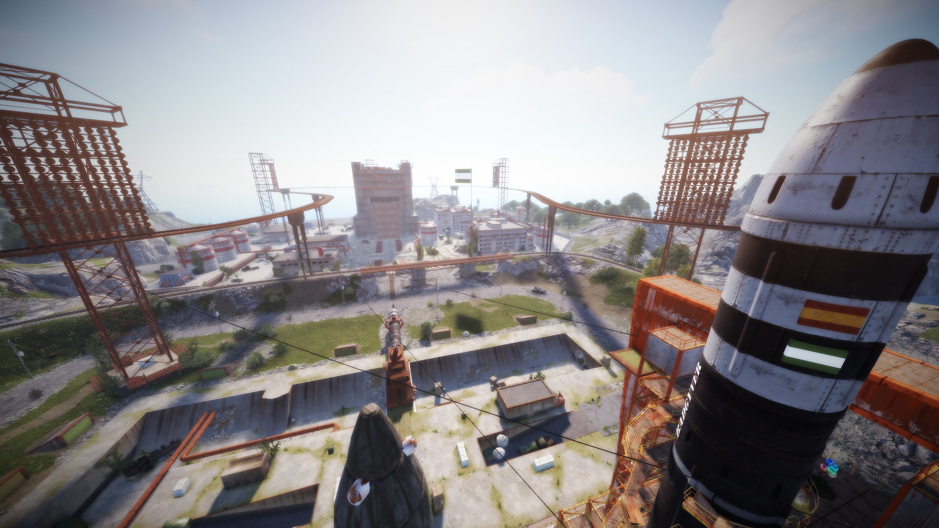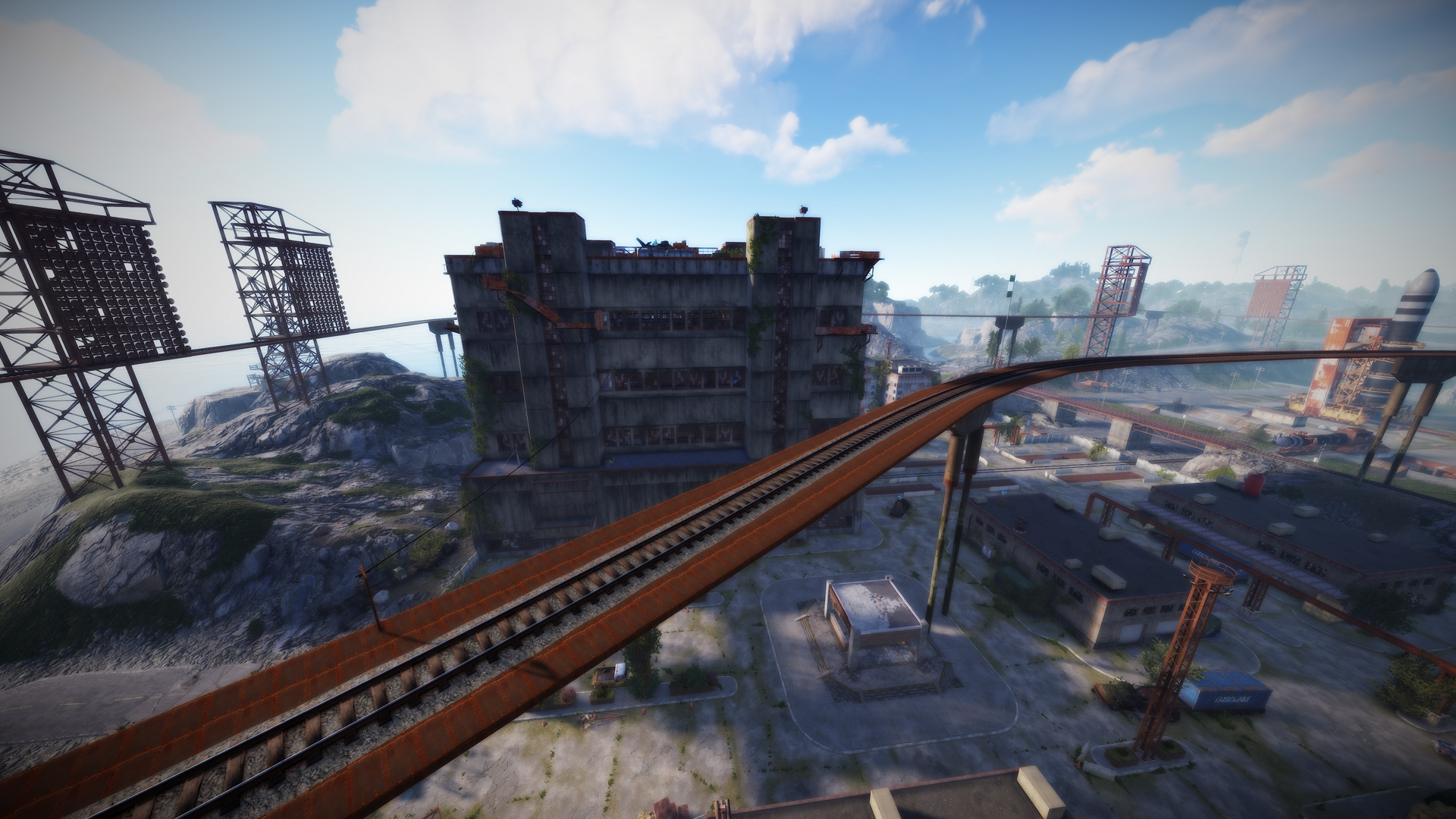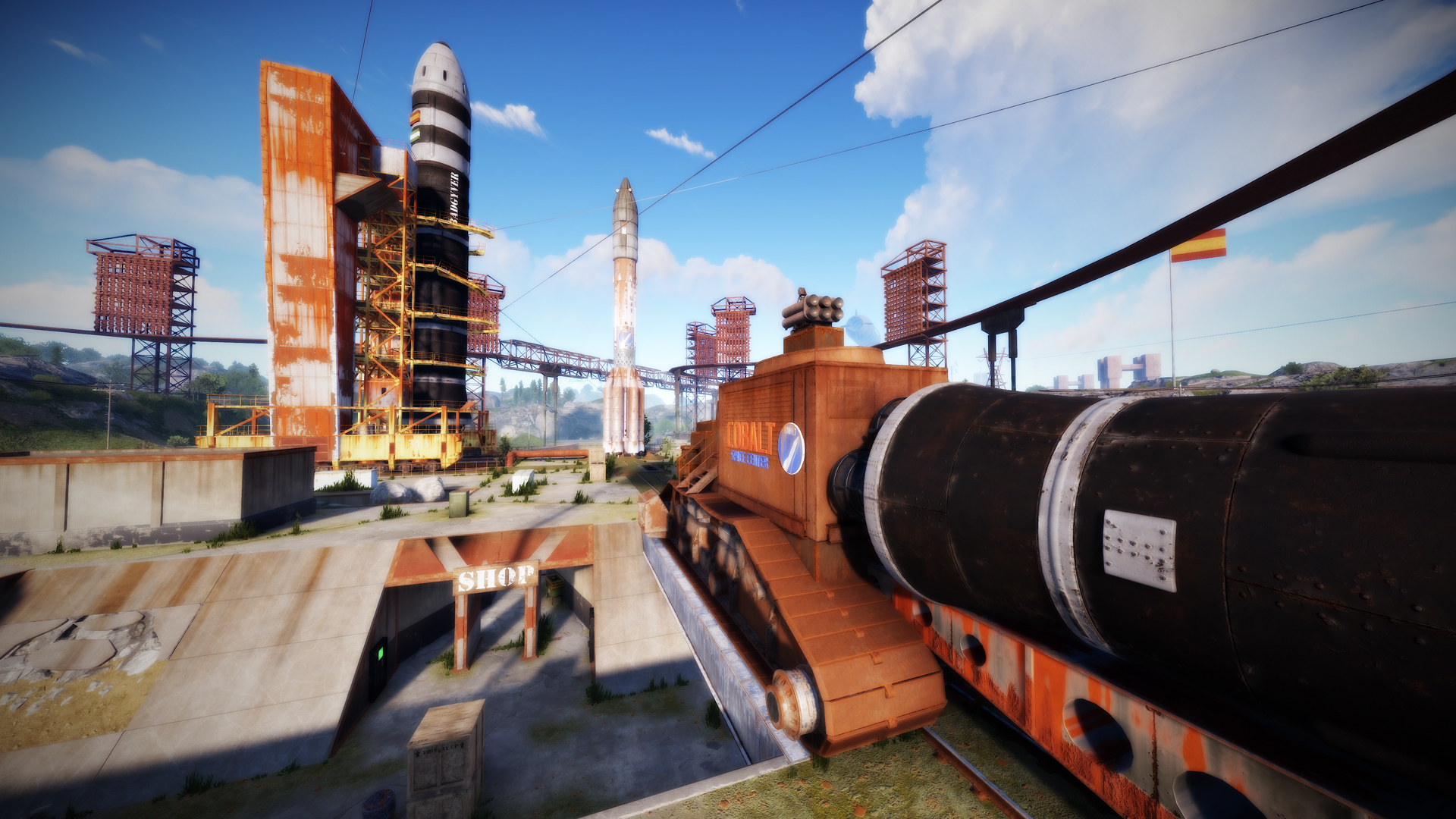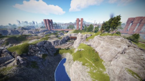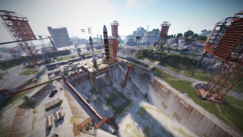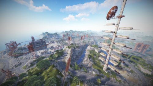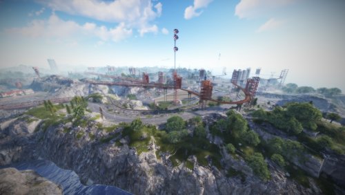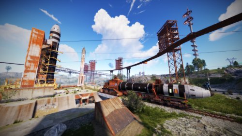• Launch site (Customized, with a monorail surrounding this monument, it also contains: Ziplines, a small store, customized loot, npcs and a tug on which you will find a red card respawn)