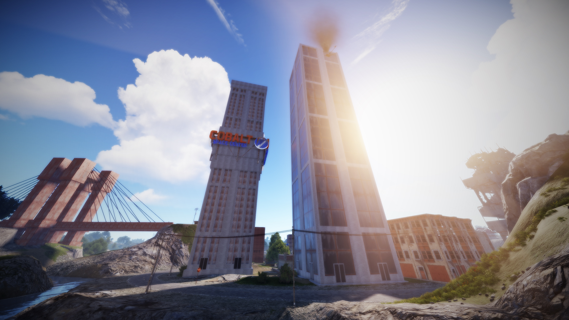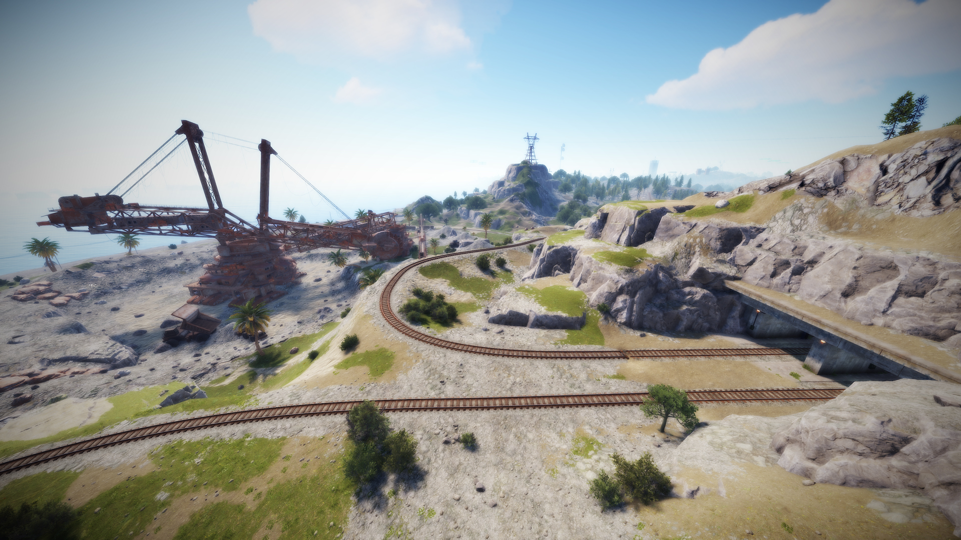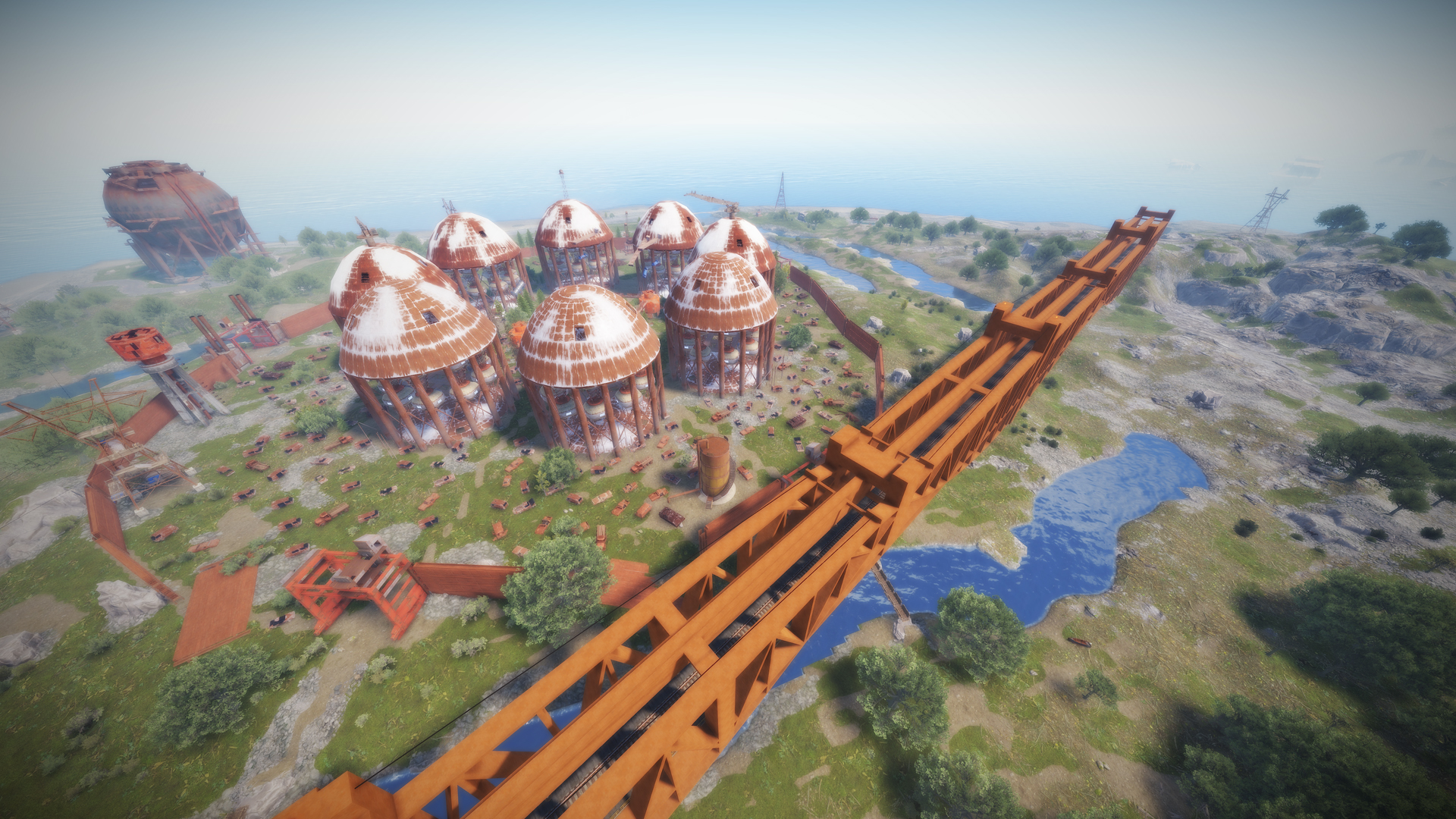 • Launch site (Customized, with a monorail surrounding this monument, it also contains: Ziplines, a small store, customized loot, npcs and a tug on which you will find a red card respawn)