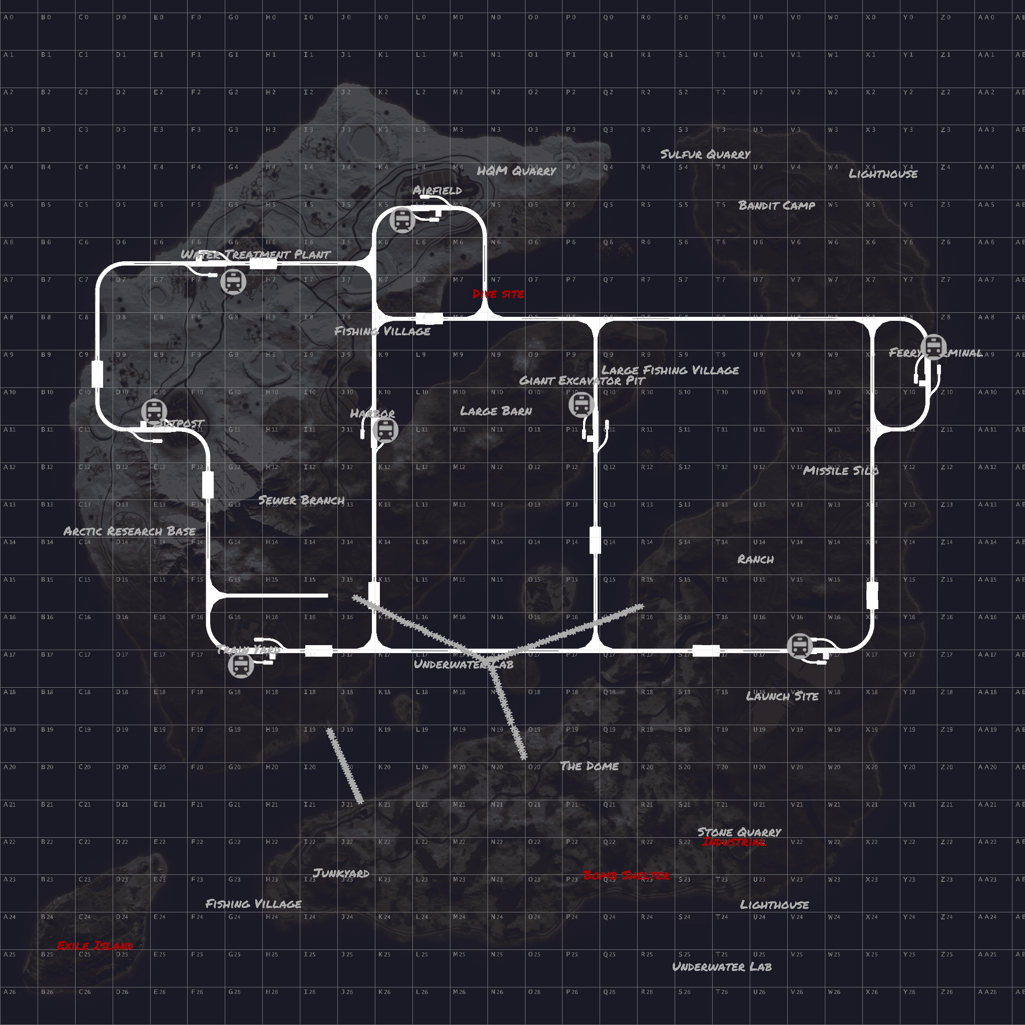 Project K is my second big project when it comes to railway systems and it features 2 big islands split by the ocean and several small islands for players to live on between the main islands , far to the south corner of the map a medium sized island called Exile Island was placed for events or farming .