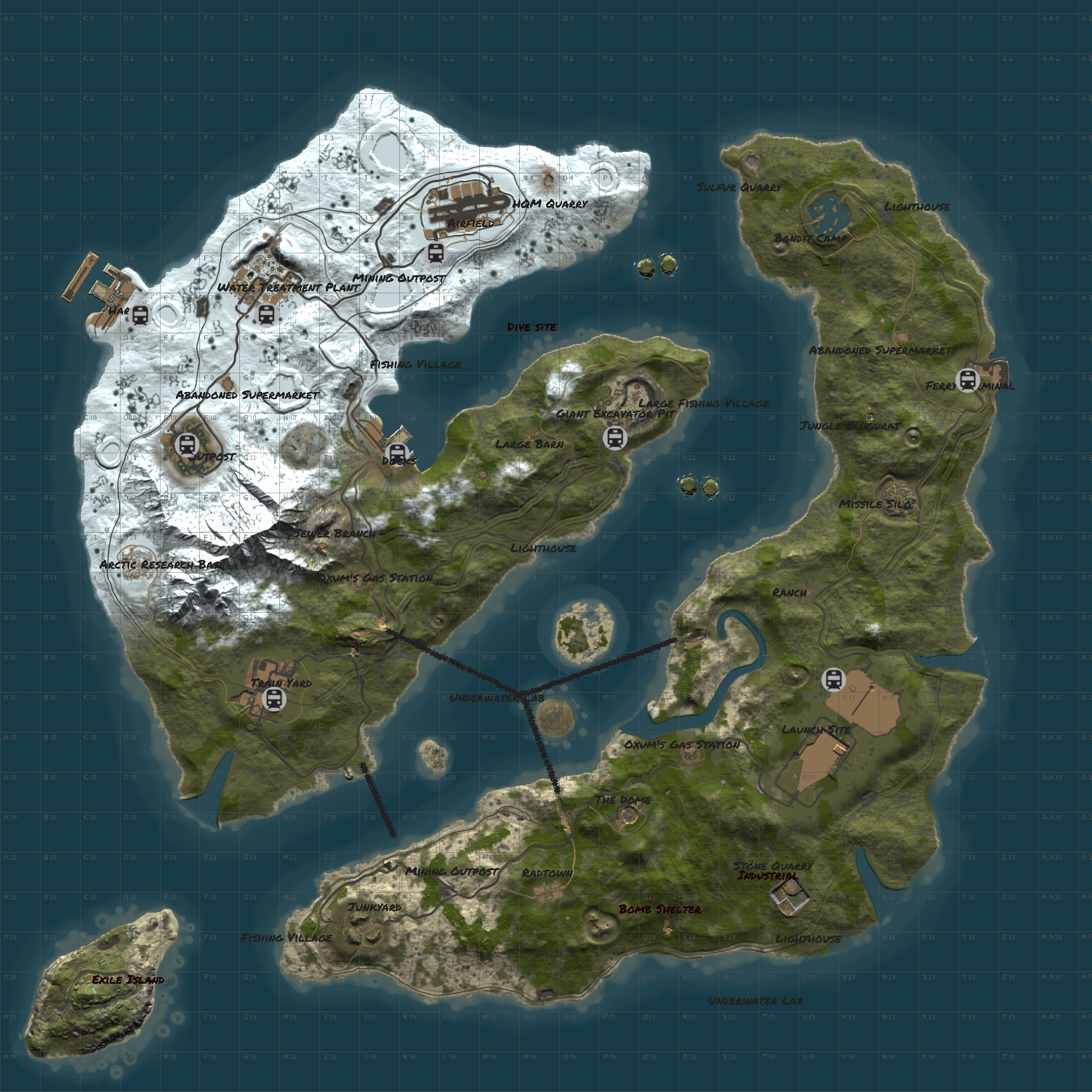 Added 2 Gas Stations / 2 Supermarkets / 2 Warehouses / Jungle new monument , replaced old Harbor with a modified Harbor and added Harbor on North side of left Island unconnected to the underground railway.