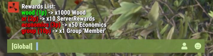 { "Use discord webhook at vote": true, "Use discord webhook at claim": true, "Discord webhook": "Your discord server webhook", "Chat command to claim reward point": [ "claimpoint", "clp" ], "Chat command for check rewards": [ "rewardlist", "rl" ], "Chat command for get reward": [ "claimreward", "cr" ], "Chat commands for checking points": [ "checkpoints", "checkp" ], "GamesFinder API": "Your API from gamesfinder.net", "Rewards": { "economics": { "Display name for chat (if empty - use key or item name)": "x50 Economics", "NeedPoints": 3, "Type": 1, "Item": null, "Command (%STEAMID% - player user id)": "deposit %STEAMID% 50" }, "group": { "Display name for chat (if empty - use key or item name)": "x1 Group 'Member'", "NeedPoints": 10, "Type": 1, "Item": null, "Command (%STEAMID% - player user id)": "oxide.grant user %STEAMID% (Permission)" }, "sr": { "Display name for chat (if empty - use key or item name)": "x10 ServerRewards", "NeedPoints": 2, "Type": 1, "Item": null, "Command (%STEAMID% - player user id)": "sr add %STEAMID% 10" }, "wood": { "Display name for chat (if empty - use key or item name)": null, "NeedPoints": 1, "Type": 0, "Item": { "Shortname": "wood", "Amount": 1000, "SkinID": 0 }, "Command (%STEAMID% - player user id)": null } }, "Reminder message": "Hey! Don't forget to vote for our server on gamesfinder.net and claim your points.", "Reminder interval minutes": 15 }