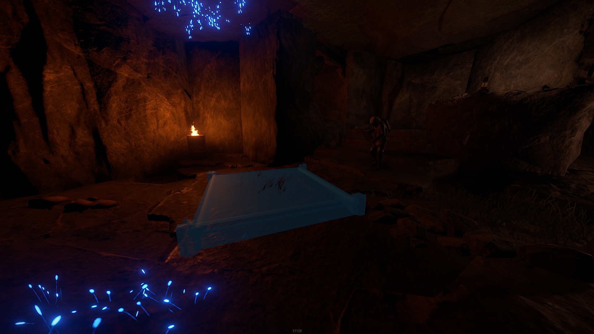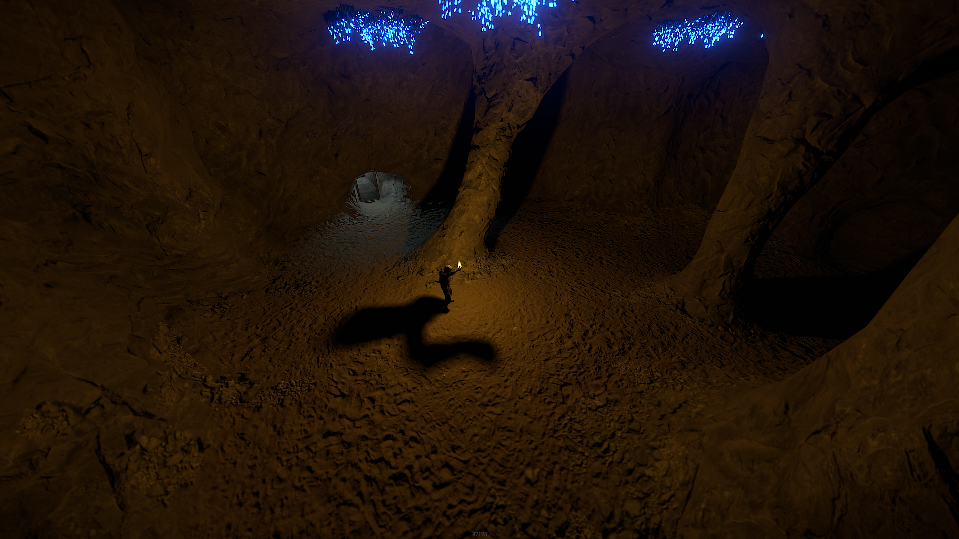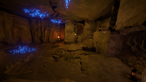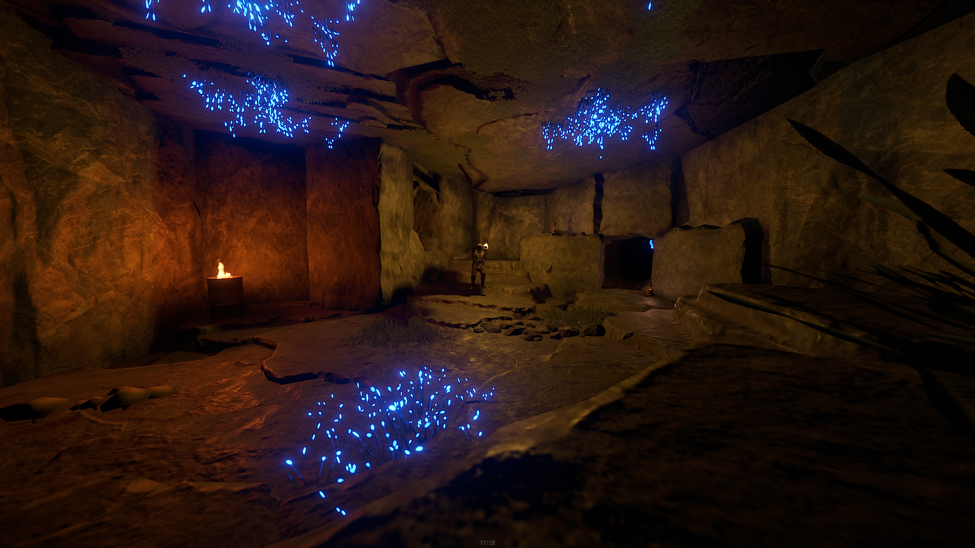 Cave system is accessible via the open hole at the back of the barn behind the car and the covers , main cave is a small space for a medium sized base with enough lighting from the ceilling glowing worms and lanterns.