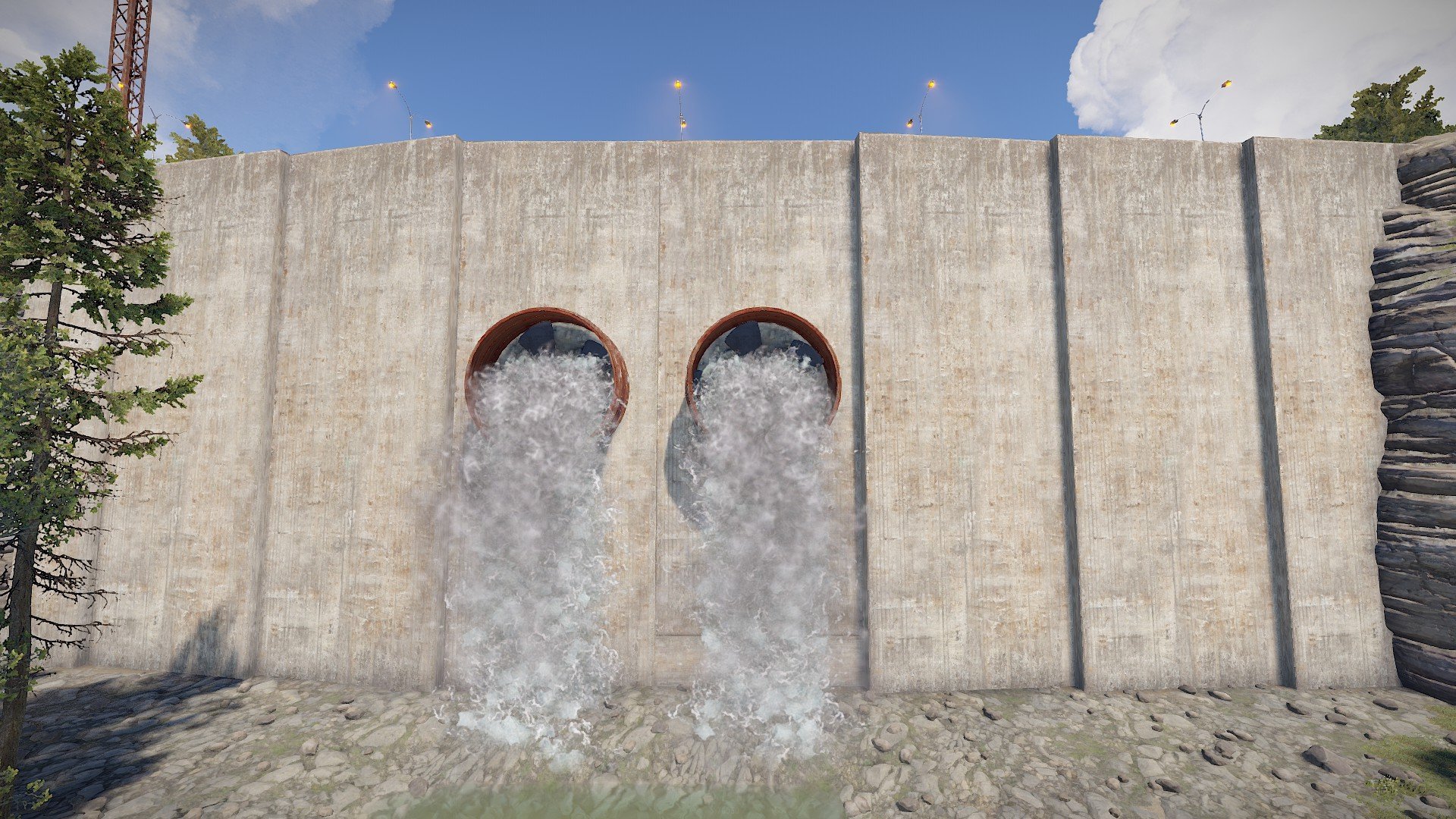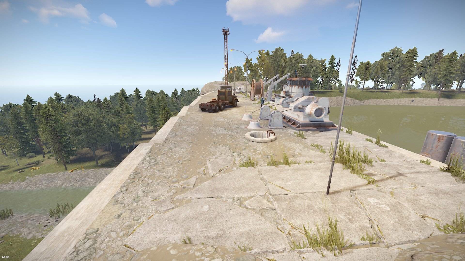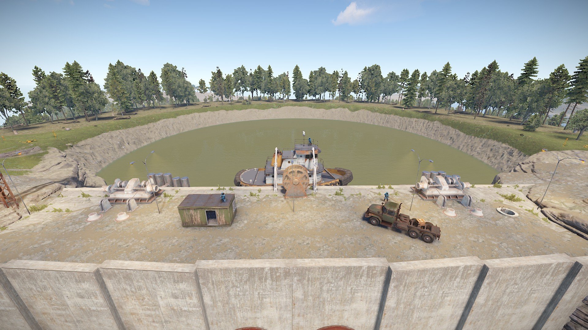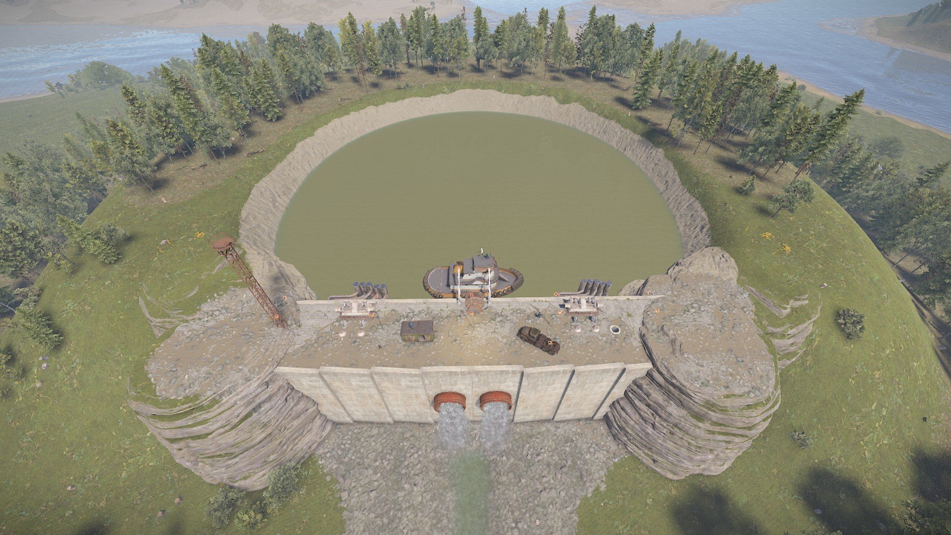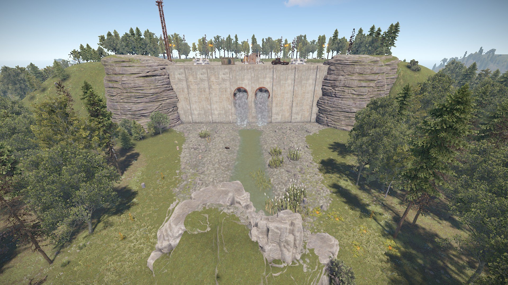 Monument with bots and loot. The damn has one tunnel entrace on top.