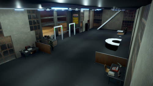Floor 0 - Lobby with desks, vending machines and metal detectors. 2 Peacekeeper bots.