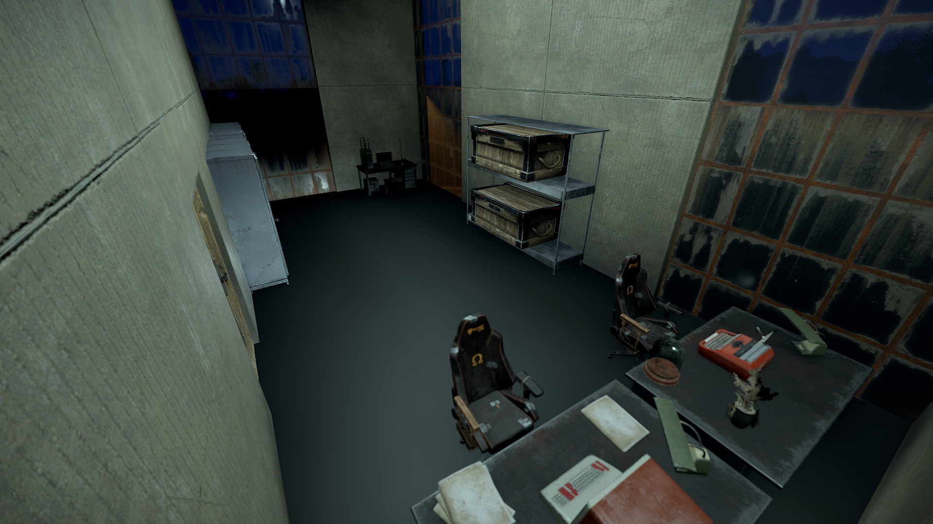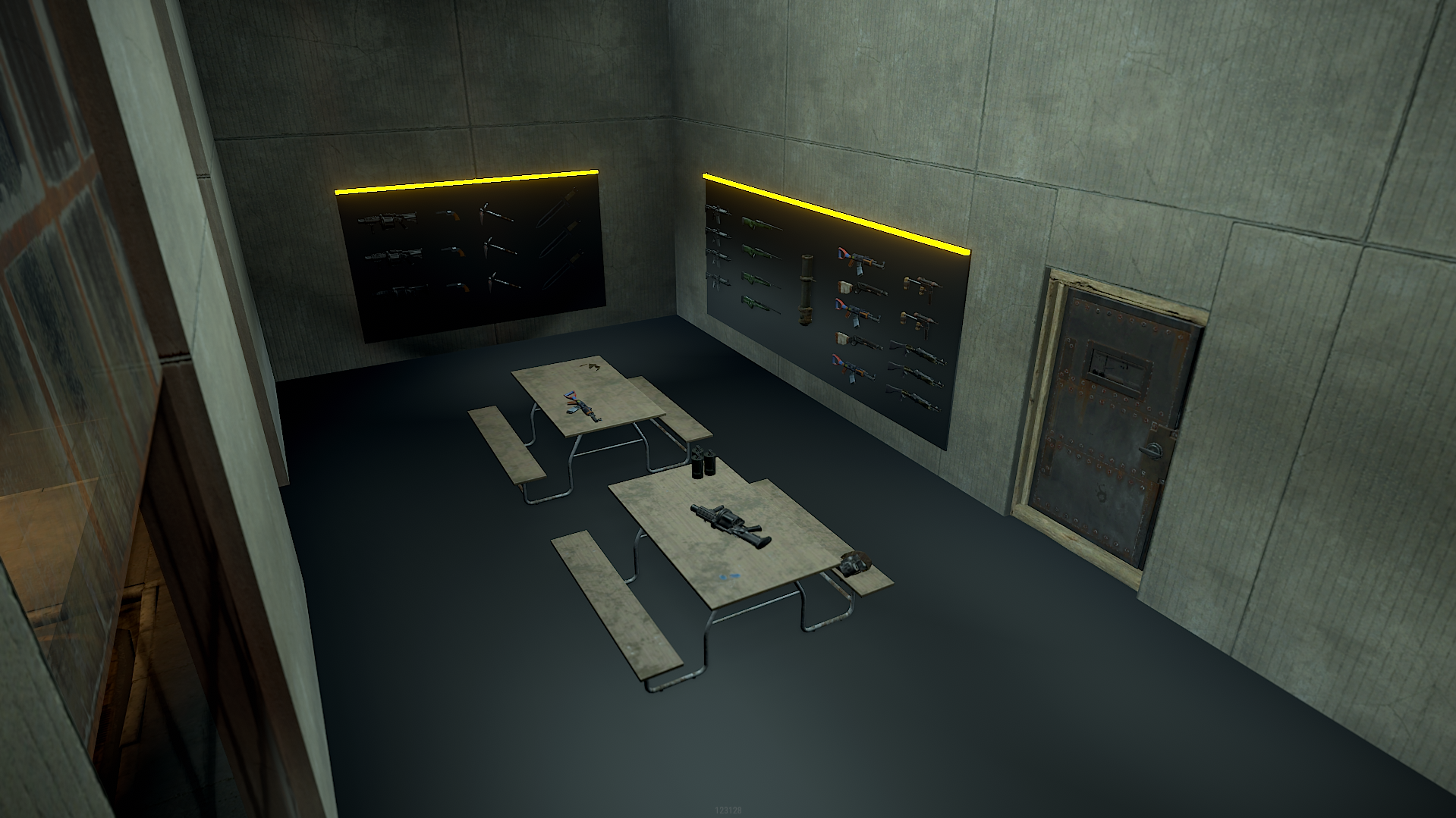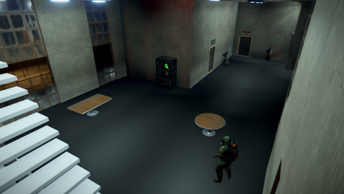Floor 1 - Lobby with more vending machines, weapons room and office for admins.