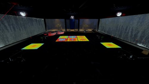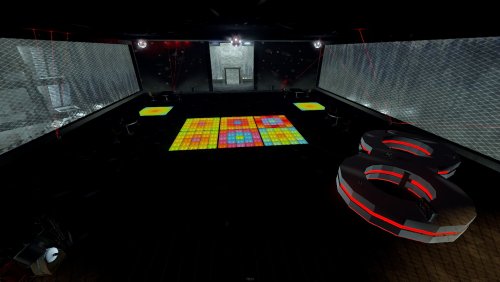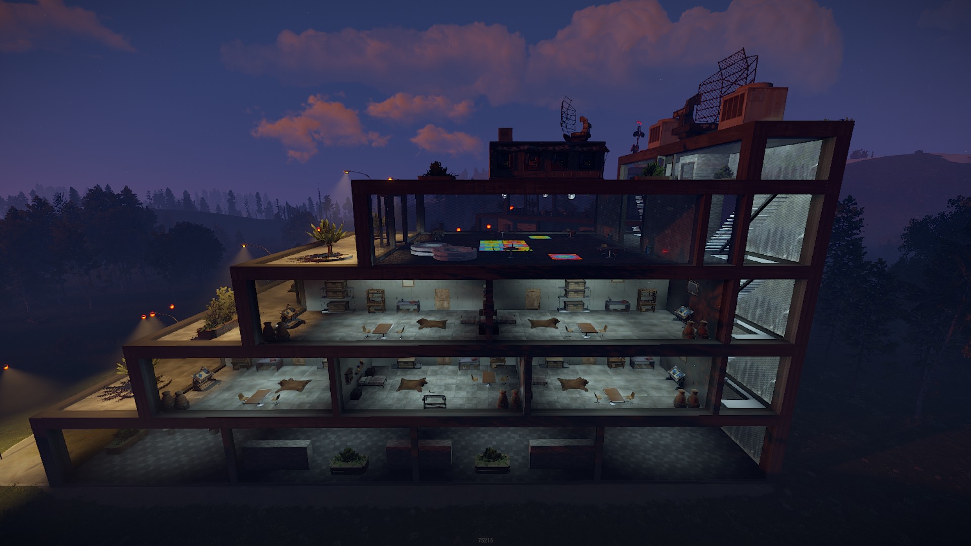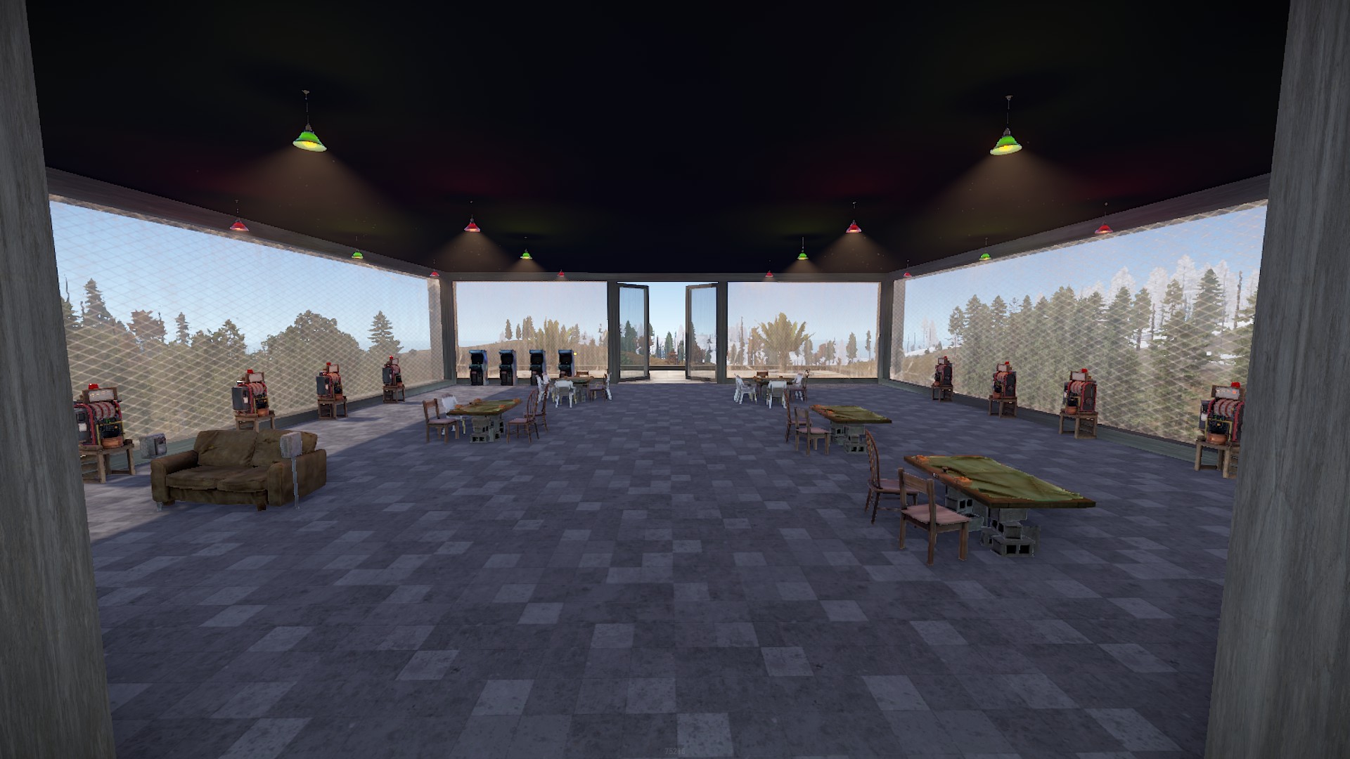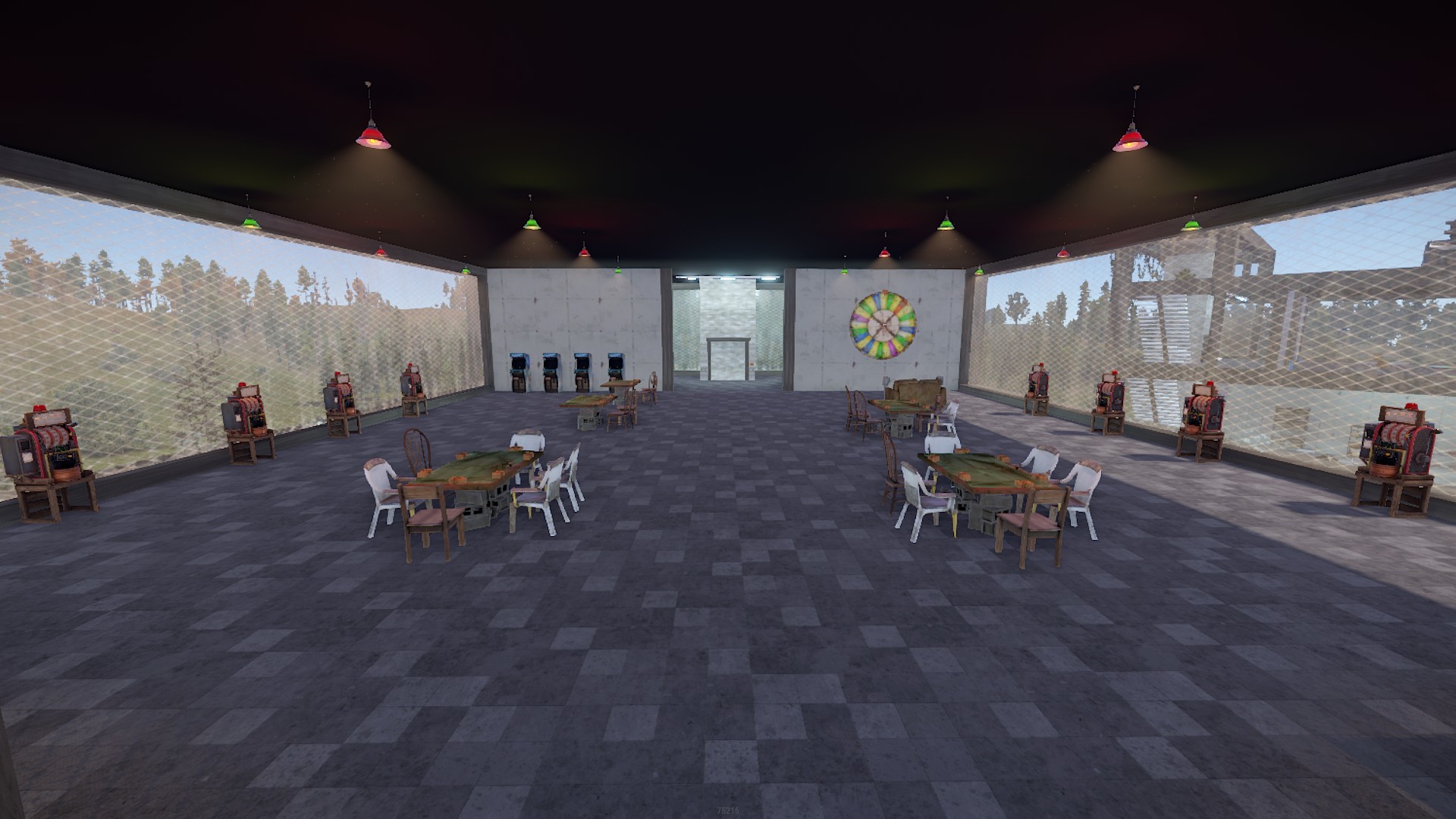 Casino on last floor with Roulette, Poker tables, Slot machines and Arcade(left building).