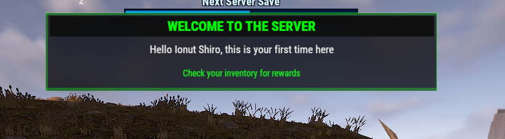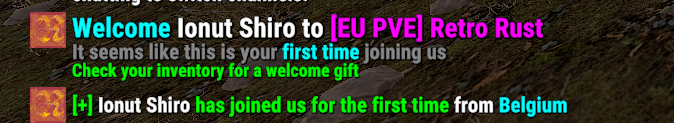 "Private Message": "<size=18><color=#00ffff>Welcome</color> <color=#FFFFFF>{player}</color> to <color=#ff00ff>{server}</color></size>\n<size=14><color=#888888>It seems like this is your <color=#00ffff>first time</color> joining us</color></size>\n<size=12><color=#00ff00>Check your inventory for a welcome gift</color></size>",