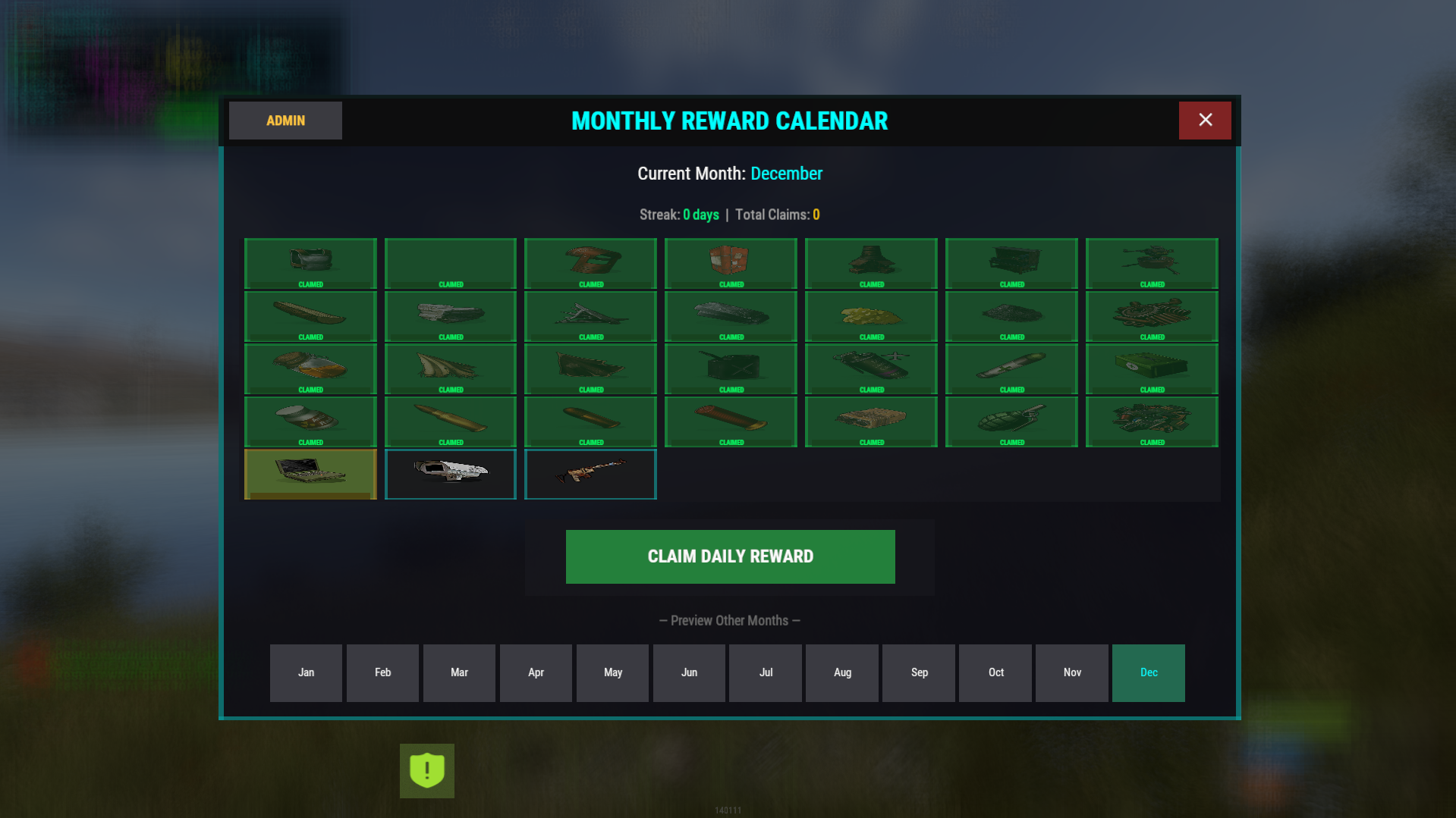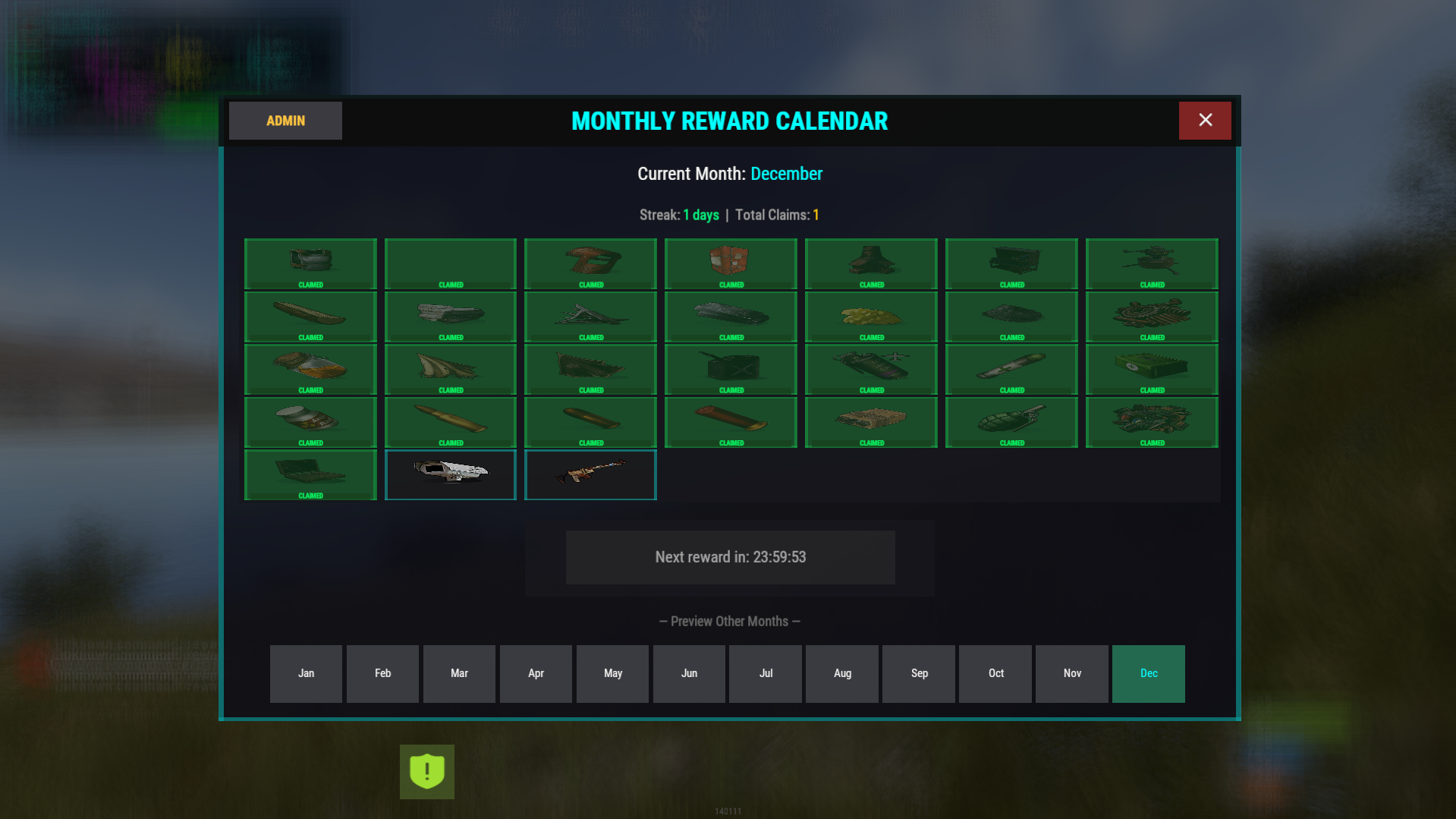 /rewards— opens the reward calendar/daily— alias/calendar— aliasAdmin