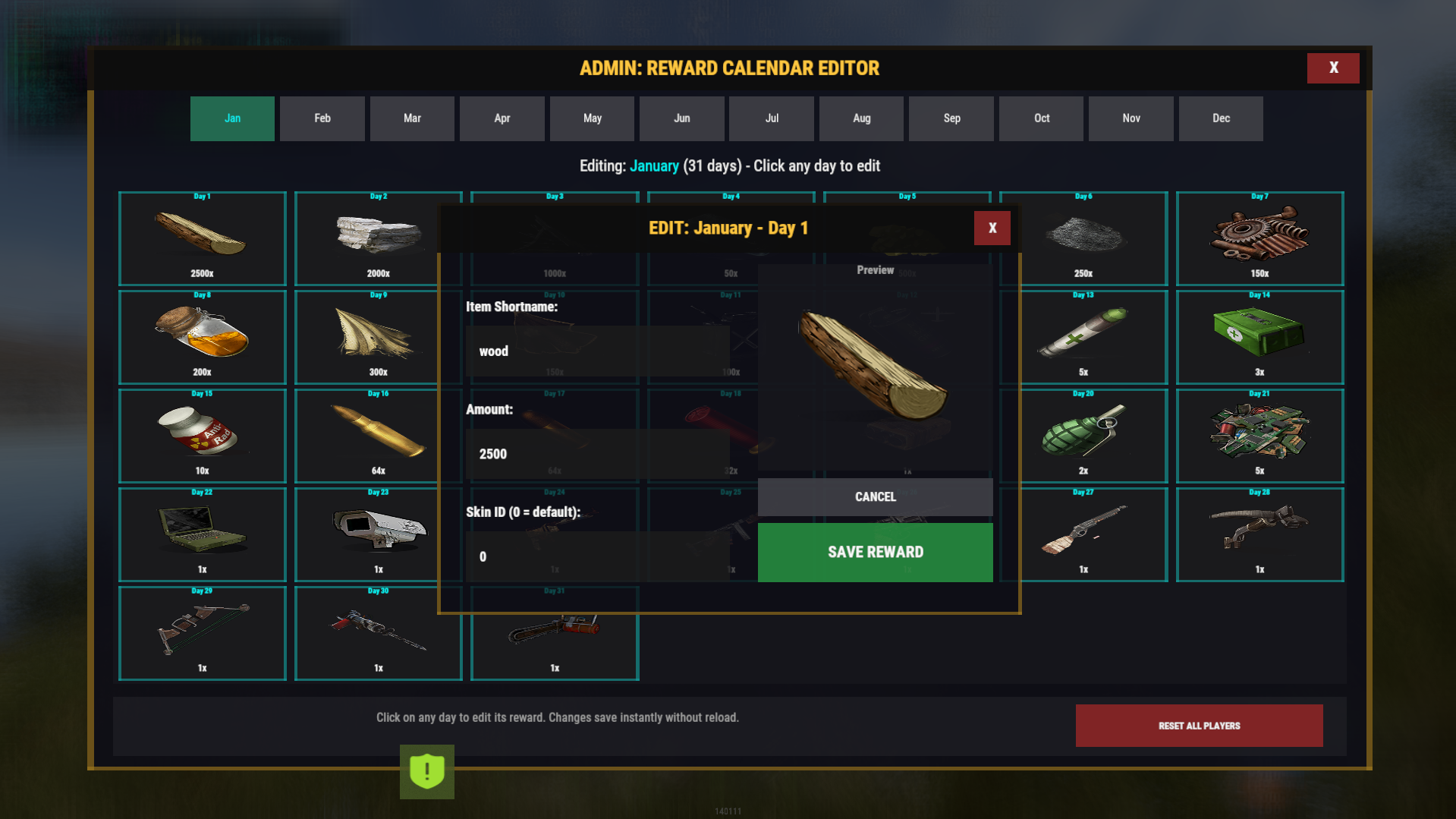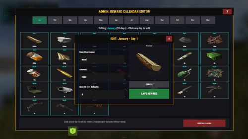 The plugin shows a clean monthly calendar UI, lets players claim daily rewards, tracks streaks, and even announces milestones. Admins get a full in-game editor, so you can change rewards instantly — no JSON editing or server reload required.